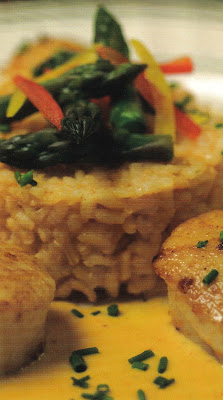So what's the main course, you ask? Sea Scallop Risotto. It's a combination of recipes I put together from different sources after seeing this picture on the cover of the May/June 2008 issue of Fresh Ideas, a magazine put out by one of our local high-end markets called Zupan's.