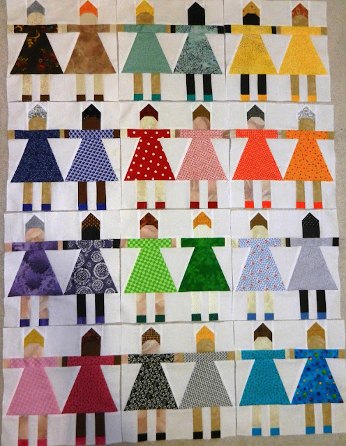 What an adorable block of the month. It looks so labor intensive. The rainbow girls are just too happy and cute. Glad you were able to get them all together.