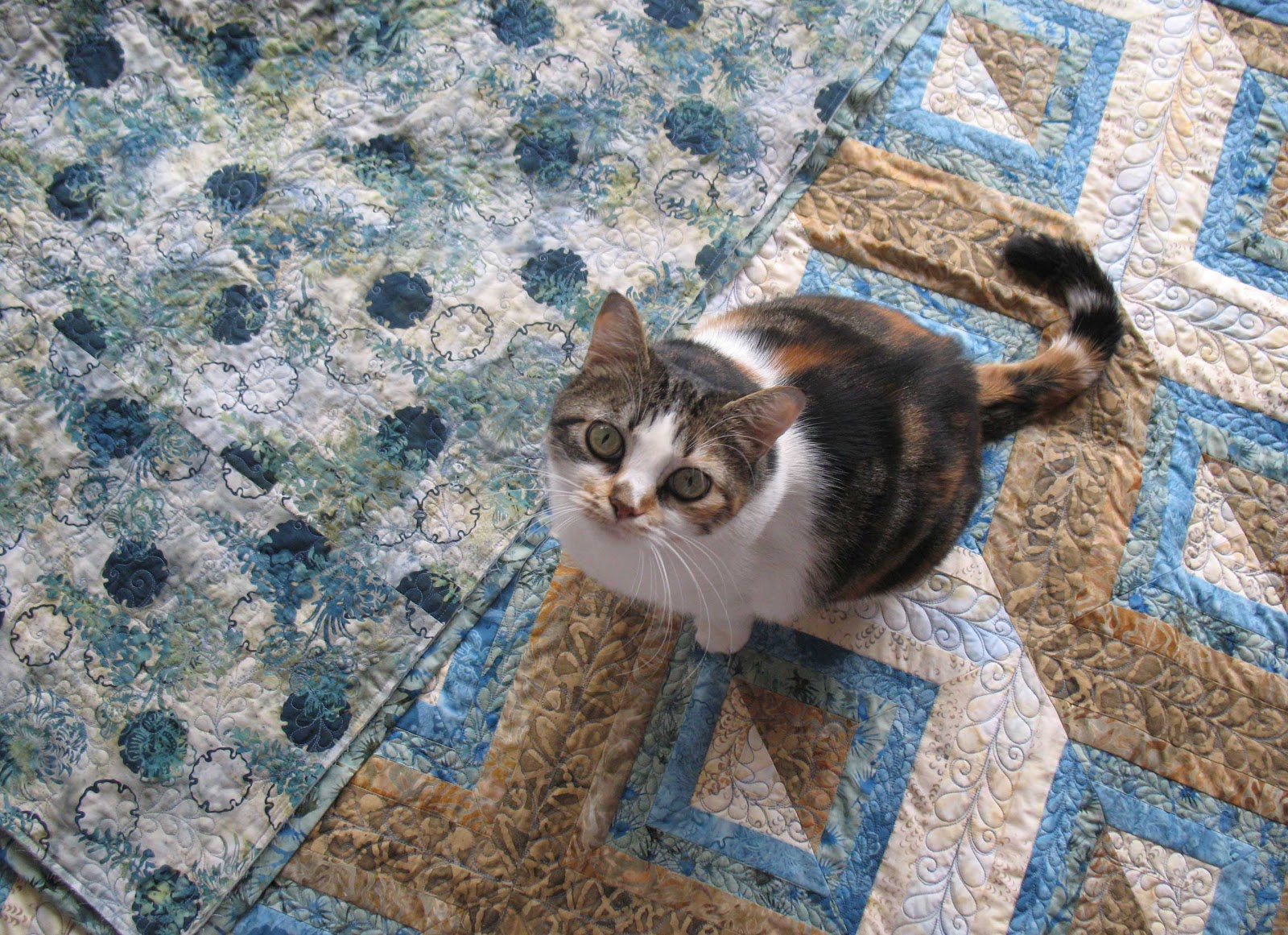 I wasn't very good about taking pictures of my quilts at the time, and so the picture above is how the quilt top looked before it was quilted. It went to my talented long arm quilter, Erin Davis, and when it came back, she'd done a beautiful job of quilting it. It passed Gracie's "cat scan". (Thank you to Sharon V. for that term.) In fact, Gracie posed so pretty on this quilt that she won a photography contest a few years back with her image below.