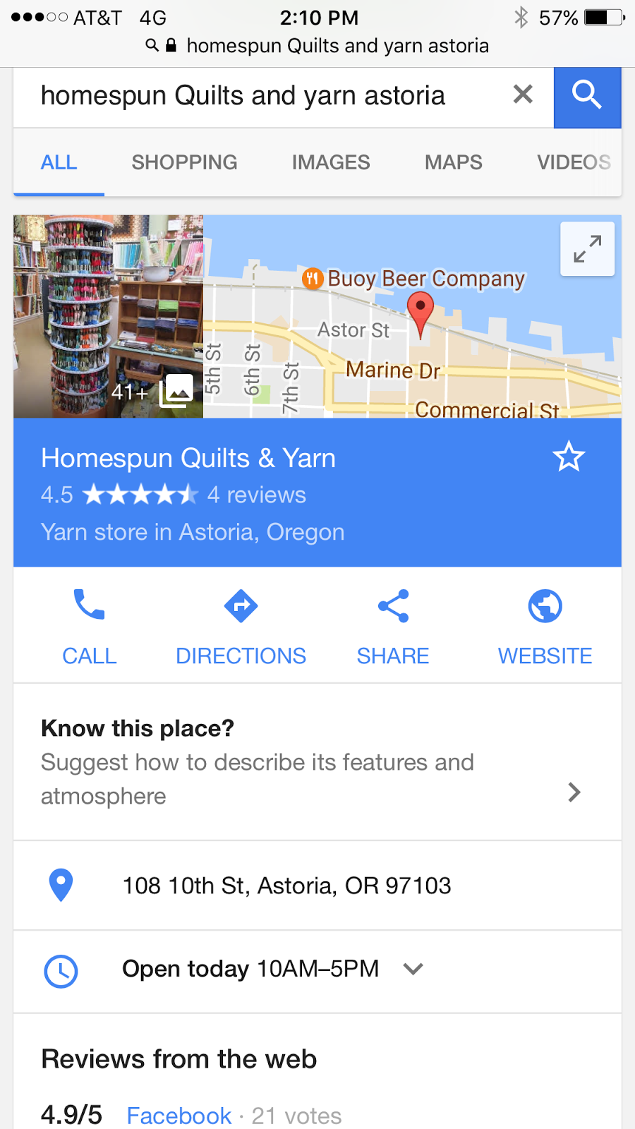 It's good that I have a quilt shop to share with you today since yesterday was a boring day of laundry and grocery shopping. It was a nice little shop, and I enjoyed my time there. My Quilt Shop app failed me this time because I was certain there was at least one quilt shop in Astoria. The Quilt Shop app identified none. Undeterred I went onto the internet and found Homespun Quilts & Yarn, just a few blocks down from the tall scary bridge.