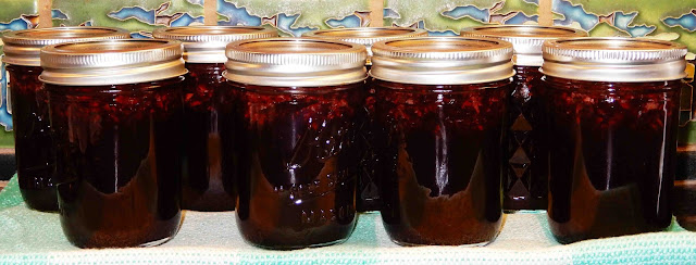 After finishing the outdoor chores, I went to work on the cherries. Yesterday's effort was quite a bit more labor-intensive than the day before. I spent most of the morning and a good part of the afternoon on this. When it was finished, there were eight half-pints of Black Forest Preserves. These have amaretto in the mix, and oh wow. This stuff is divine. It's very much the consistency of jelly. We put it on our ice cream last night, but with the jelly consistency, it's more like a hot fudge sauce. I'd like to try warming it in the microwave a little bit, and then I think it would be great as a hot black forest sundae. Yum.
