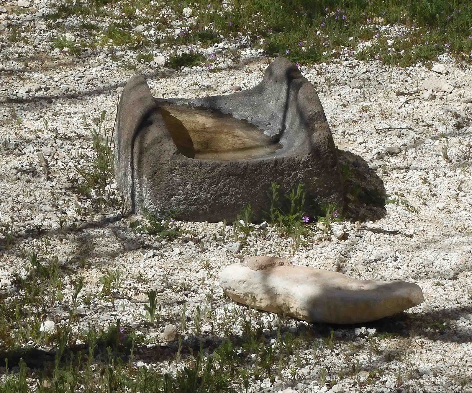 In the center of each of the two remaining rooms was a rock "basin." Each held a few inches of water from recent rains. We weren't certain of their function. Were they to hold water? To grind corn? Both? Hard to say.