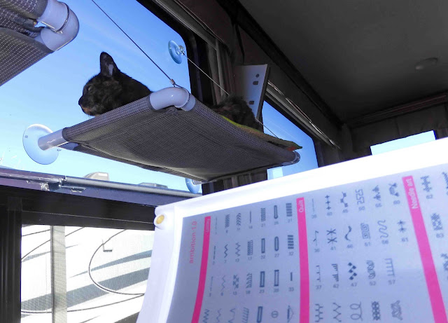 It's not true that nothing has been accomplished. I got out the sewing machine yesterday and got more than halfway sewing the blocks together. Since my window seat is now in shade most of the day, I was having trouble seeing the black on black fabric...not to mention the black thread. It made sense to use my little Daylight lamp. You might remember that I bought a "Slimline lamp" when we visited the Road to California Quilt Show, pre-pandemic. When I purchased the Slimline lamp, the "Smart Clip-on Lamp" came as a free gift. You can see it in the image below attached to the right side of the sewing machine.