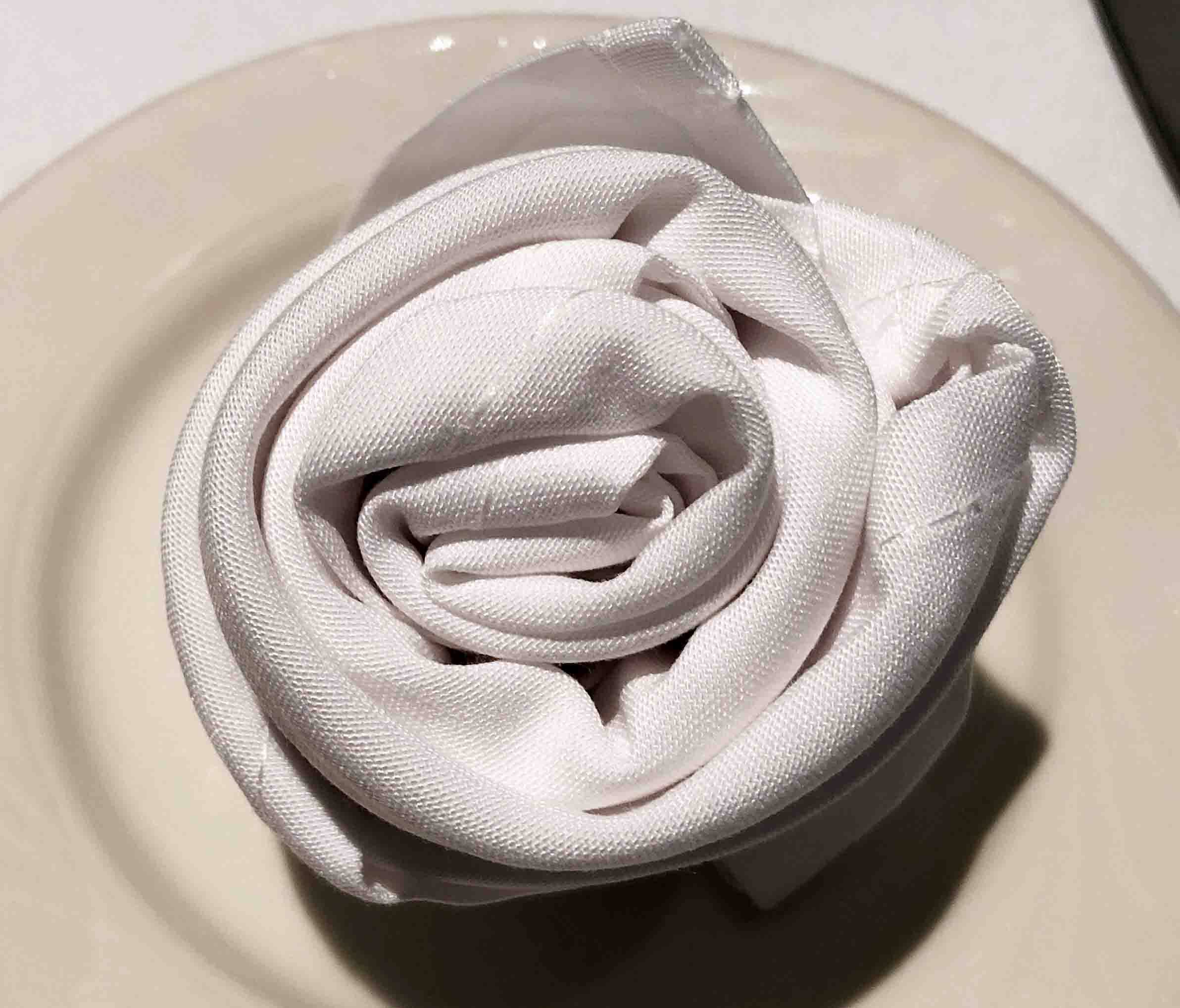 We had dinner reservations with the restaurant associated with the RV park. They did a nice job. We ordered off the regular menu, but they also had a special surf 'n turf dinner for two if we'd wanted to go that route. I'm a great fan of napkin art, and the napkins were folded tightly into rose buds.