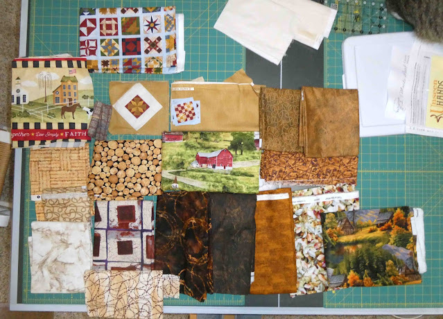 So next on my to-do list is to sew together the quilt top for the Heartland Barns. As I've been working on this quilt, I've come across fabrics that I might use in the quilt top (or back). As I found them, I dropped them into the project box. As you can see, I've collected quite a few possibilities. Um...excuse me...could you just...