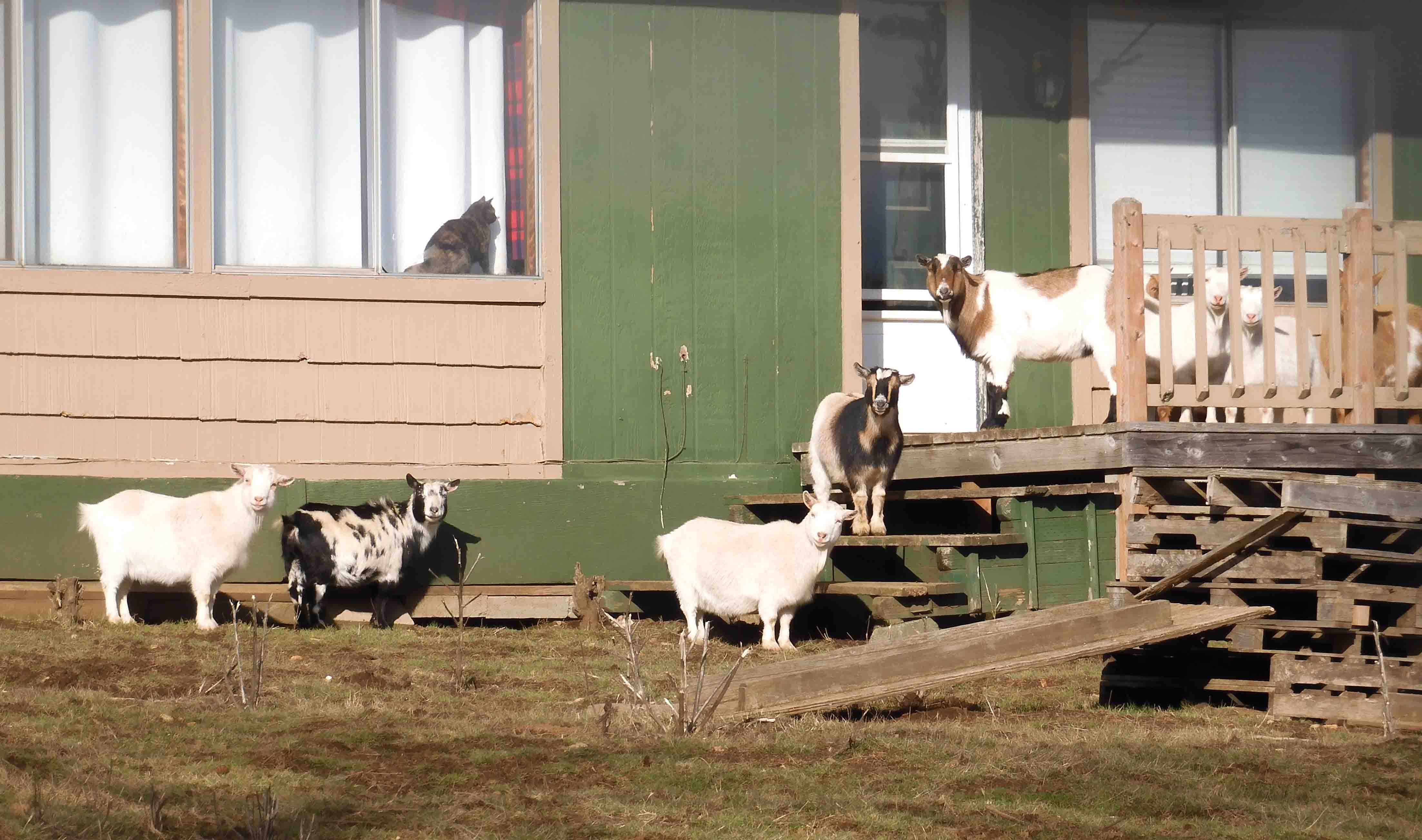 One of our neighbors has a herd of goats. They are so funny and cute. I climbed a small embankment to get above their fence for this picture. They were about 50 yards away hanging out at the front porch. I didn't notice the cat in the window until I took this picture off my camera this morning.