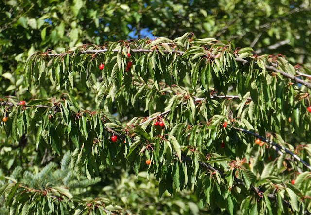 Okay, so that will be on today's agenda. I didn't need a lot of sweet cherries, but I want to make some cherries in syrup. I use those to make our skillet cherry cobblers, possibly my favorite dessert in the whole wide world. Also, I want to make some sweet cherry jam. I'm hoping we'll get some cherries from our neighbors' tart cherry tree for some tart cherry jam as well. We checked their cherries yesterday, and they still need more time. Fortunately, theirs are all on the down low. No ladders are required.