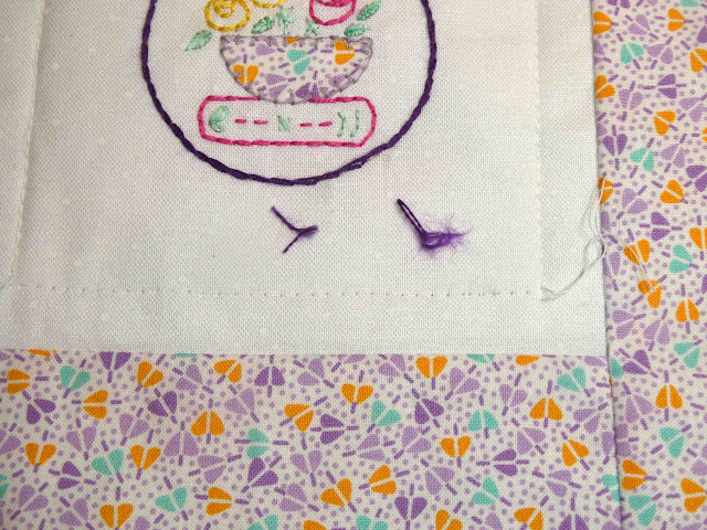 Okay, so let's catch up on our sewing, shall we? After finishing quilting for the day on Monday, I noticed some purple embroidery floss showing through from the back on the block below. Rats. My friend, Kate, would never have let this happen. Kate is a champion at cleaning up the backs of her quilts. I used to be better, but sometimes I forget to look.