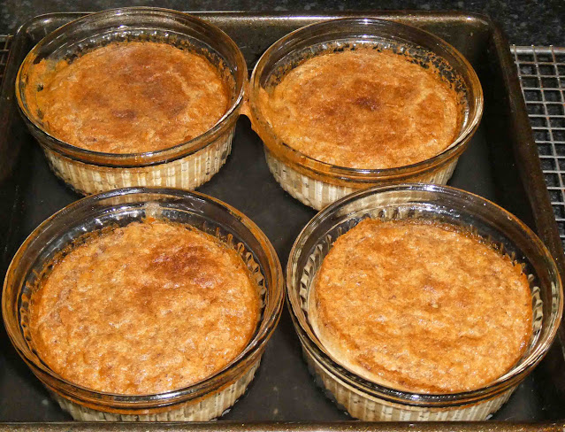 I've linked to the recipe back there. My mixture was cut it in half to make this a "for two" recipe. I used four 8-oz ramekins. The only other thing I did differently was to bake them in a water bath. Any custard I've ever made suggested putting the ramekins in a pan and then filling the pan with boiling water until it comes halfway up the sides of the ramekins. It helps to keep the custard from drying out and cracking.