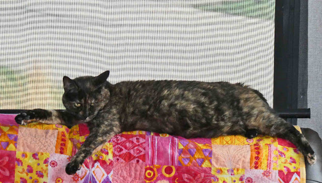 Good morning, my friends. It's a sunny morning here in Colorado Springs. Miss Sadie was soaking up the sun until she got too hot. We're in a very nice state park, Cheyenne Mountain State Park, just southwest of Colorado Springs. Colorado has very nice state parks. We stayed in one a few years back when we visited Ouray and Silverton.