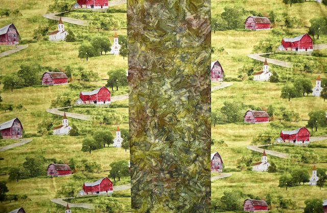 And then I sewed the outer border on. From there, I had enough length of this barn fabric to use it as a backing. I just barely trimmed off the center fold from my yardage and sewed the two sides together with a 12-inch wide strip of green to give me enough width.