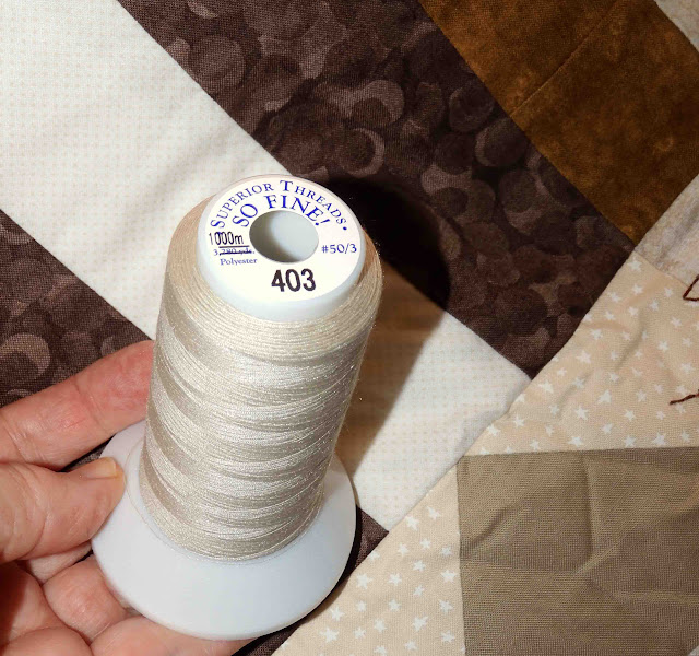 For the top thread, I'll use this tan So Fine thread. It's a 50 weight thread, and so it should play well with the 60 weight Bottom Line thread in the bobbin. The So Fine thread was a gift from my quilting fairy godmother, Ila. Thank you, Ila.